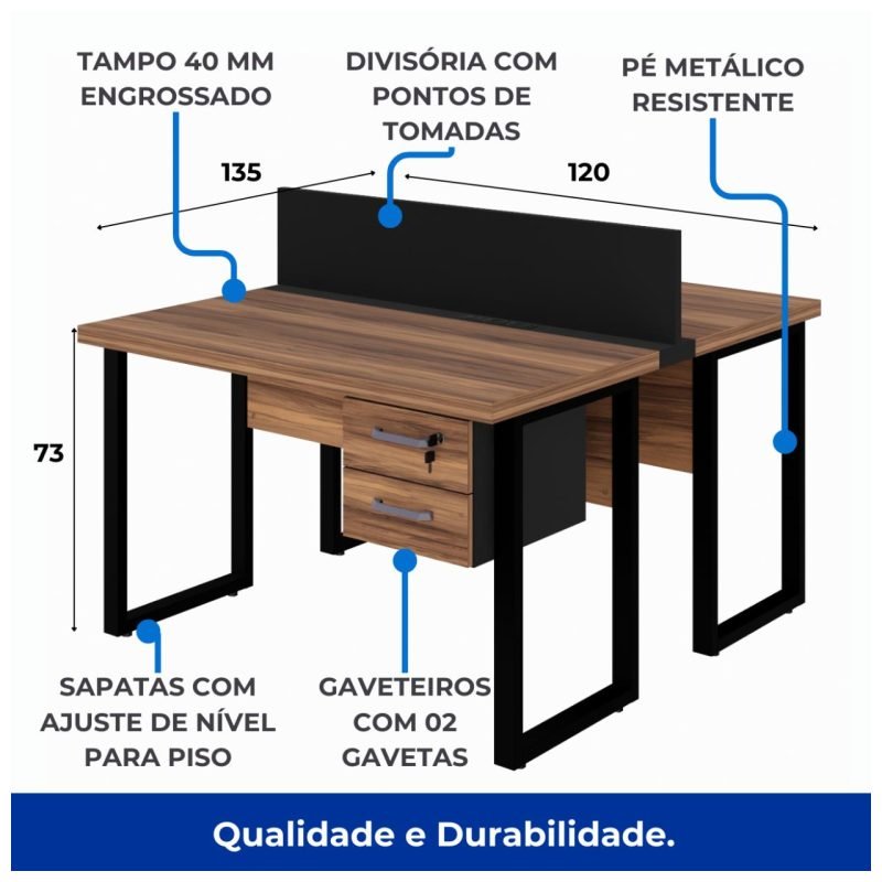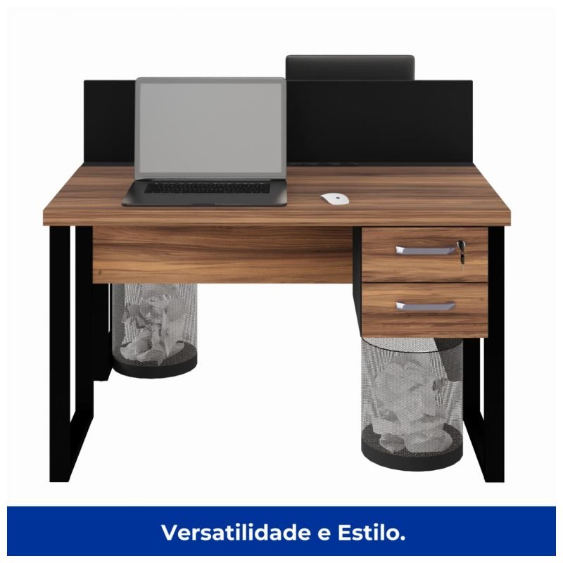 Estação de Trabalho Dupla 1,20×1,35m 02 Lugares c/ Gavetas c/ ponto de tomada PÉ QUADRO – Cor Nogal Sevilha – 63097