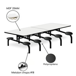 Móveis para refeitório e copa empresarial. Mesas com bancos integrados e conjuntos de aço ou MDF. Resistência e higiene para seu espaço.